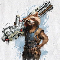 The image shows an illustrated character that resembles Rocket Raccoon from the Guardians of the Galaxy franchise. He is depicted with a confident and somewhat mischievous expression, holding what appears to be a weapon or device in his left hand. The style of the illustration is dynamic and artistic, with splashes of color that suggest motion or energy.