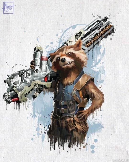 На картинке изображен иллюстрированный персонаж, напоминающий Ракетного Енота из франшизы Стражи Галактики. Он изображен с уверенным и несколько озорным выражением, держа в левой руке то, что кажется оружием или устройством. Стиль иллюстрации динамичный и художественный, с брызгами цвета, которые предполагают движение или энергию.