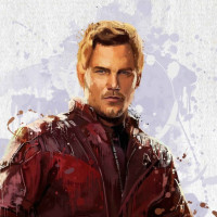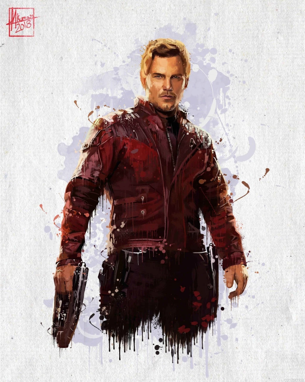 painted portrait of the character Star-Lord from the Guardians of the Galaxy movies. He is depicted in his signature red and black jacket and holding a gun. The painting has