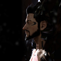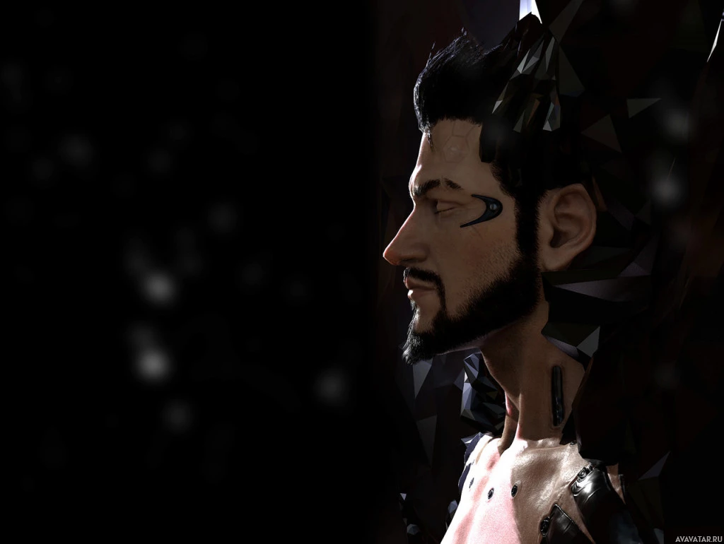 the video game "Deus Ex." This character is likely one of the protagonists or antagonists in the game, and he's shown with a thoughtful or serious expression. The background is dark and somewhat out of focus, which could suggest that this screenshot was taken during