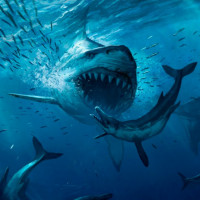 The image depicts a scene from an underwater environment, where there is a large shark swimming amidst several smaller sharks. The larger shark appears to be the center of attention for the smaller ones. It's an action-packed image that captures the dynamic behavior of sharks in their natural habitat.