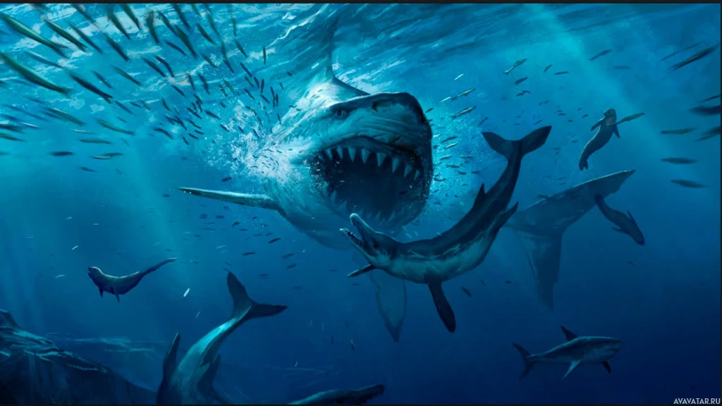 На картинке изображена сцена из подводной среды, где среди нескольких мелких акул плавает большая акула. Более крупная акула, по-видимому, является центром внимания для более мелких. Это насыщенное действием изображение, которое фиксирует динамичное поведение акул в их естественной среде обитания.