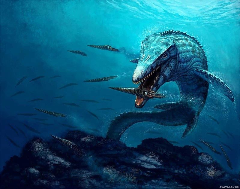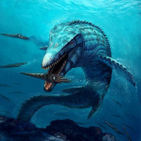 body structure, and fins typical of a marine reptile like a crocodile. The creature is surrounded by several