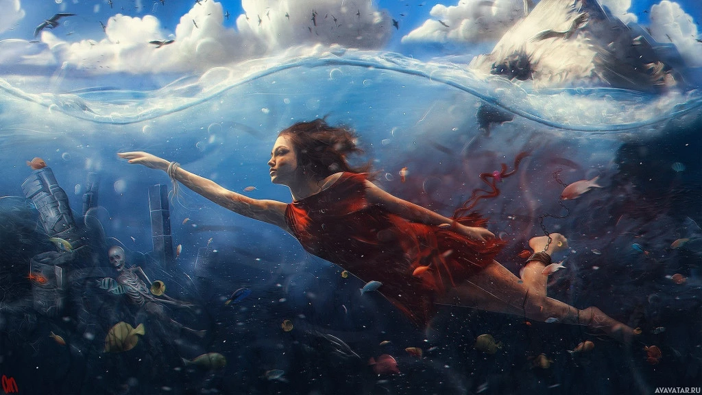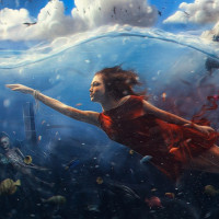 This is an artistic image featuring a woman who appears to be floating or submerged in water. She has her hand reaching out as if she's interacting with something beneath the surface, and her hair flows around her head, suggesting movement through water. The environment around her includes various aquatic elements such as