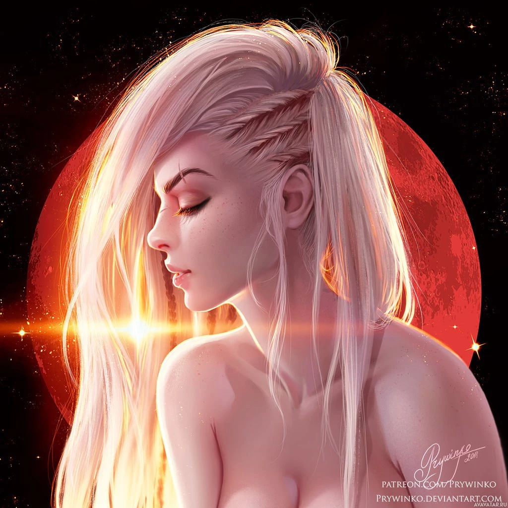 white skin and is wearing what seems to be fantasy or science fiction-style armor or clothing that includes elements like tattoos or markings on the neck. Behind her, there's an illustrated backdrop of