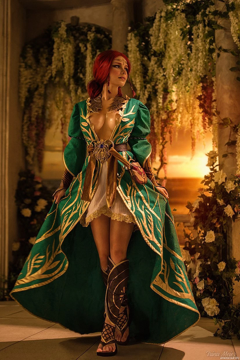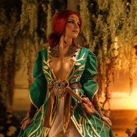 In the image, you see a character dressed in elaborate and ornate armor and attire that resembles Triss Merigold from "The Witcher"