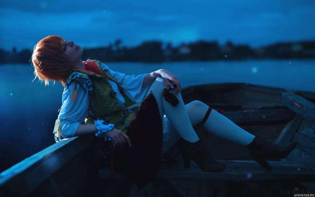 cosplay costume, which includes detailed armor and clothing that matches the fantasy theme of the game. The character is portrayed in a thoughtful pose while sitting on what appears to be a boat docked at night by