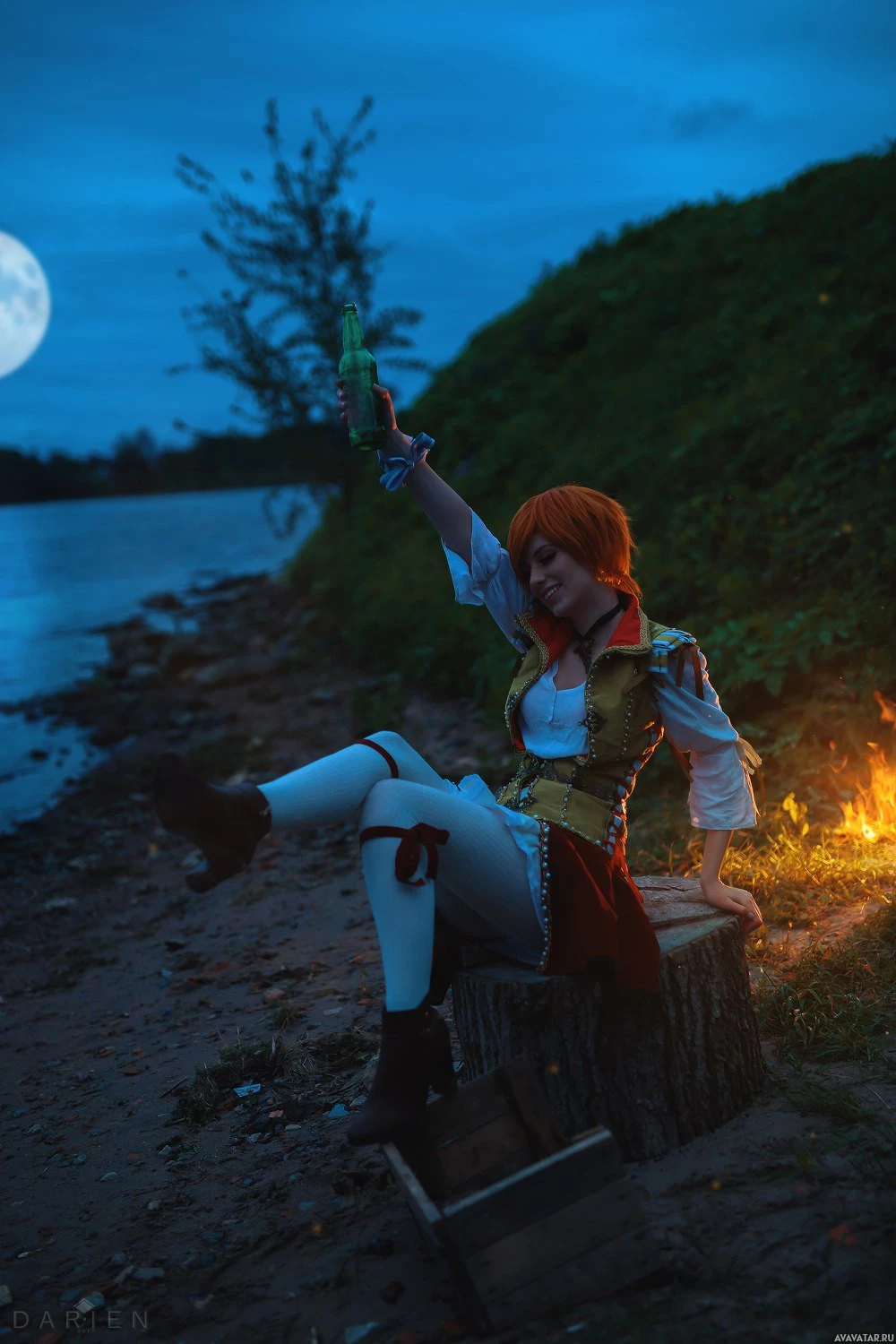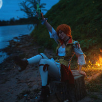 The image features a person dressed in cosplay, representing the character Shani from "The Witcher" game. They are sitting by what appears to be