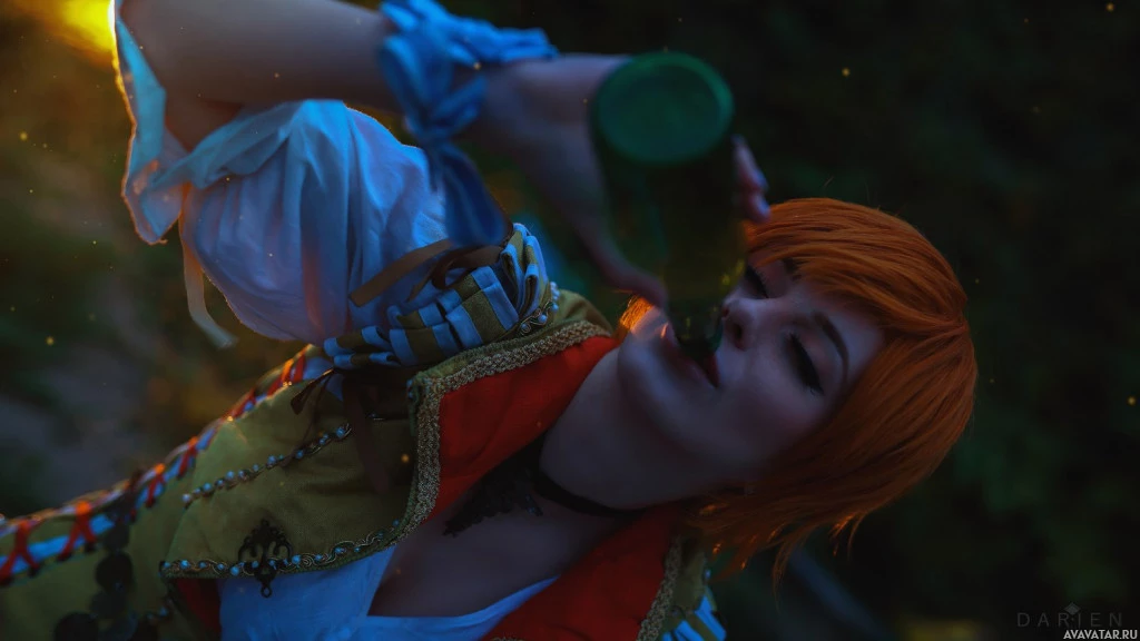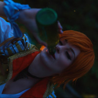 video game. The individual is wearing makeup to enhance their appearance and is holding what appears to be a potion or liquid in one hand while resting the other arm on a surface, which could be part of a costume or a prop. The setting seems to be outdoors during dusk or evening, as indicated by the soft light and
