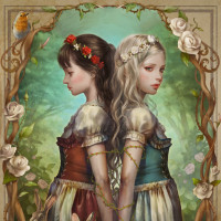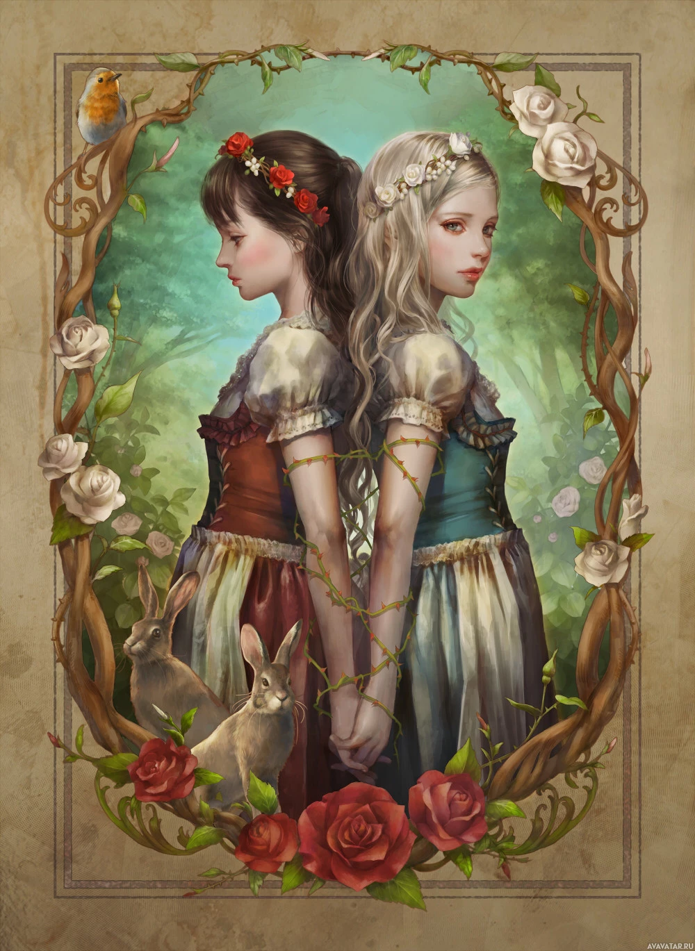 blonde hair and the other has brunette hair. They are wearing medieval-style dresses, suggesting a historical or fantasy theme to the illustration. Surrounding them is a lush,