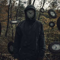 a black hoodie and has their face obscured by a white mask that resembles a clock. There are numerous clock faces floating around the person, which creates an eerie and surreal effect. This composition suggests a theme of time or possibly mortality given the mask's association with