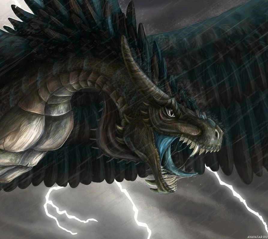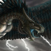 a dramatic sky with dark clouds and lightning bolts, suggesting that the scene might be taking place during a storm or battle. The overall style of the artwork is detailed and realistic, which could suggest it's part of a fantasy-themed illustration rather than an actual photograph of a creature.
