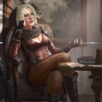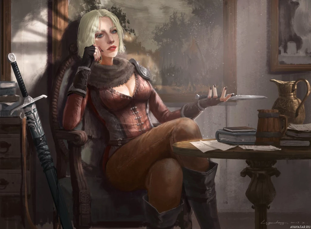 blonde hair and is wearing a red outfit with intricate details. There's a sword leaning against the wall nearby. In front of