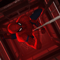 The image features a character dressed in the red and blue costume associated with Spider-Man. This figure is shown in