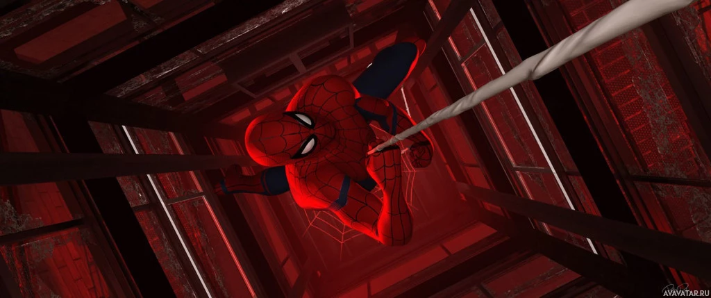 a dynamic pose, as if it is leaping or swinging from one location to another, which is characteristic of Spider-Man's superhero abilities. The setting appears to be