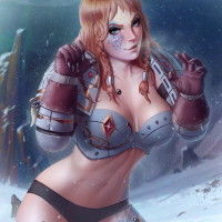 female character with red hair, dressed in fantasy armor and lingerie. She is posing with one hand on her hip and the other playfully covering her mouth as if she's pouting or making a cute face. The background suggests a snowy, possibly fantasy-themed setting with mountains and a dark,