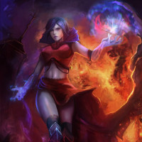 The image features a fantasy-themed illustration of a female character. She has purple hair and is wearing a red outfit with a cloak, suggesting she might be portraying a warrior or mage archetype common in fantasy stories. The character stands against a backdrop that resembles volcanic lava, further emphasizing the fantasy setting.