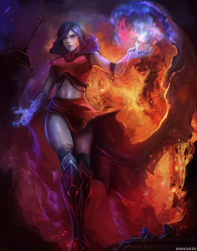 На картинке изображена иллюстрация женского персонажа на тему фэнтези. У нее фиолетовые волосы и она носит красный наряд с плащом, предполагая, что она может изображать воина или архетип мага, распространенный в фантастических историях. Персонаж стоит на фоне, который напоминает вулканическую лаву, еще больше подчеркивая фантастическую обстановку.