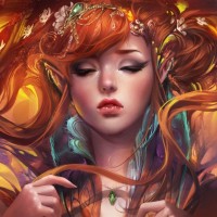 The image depicts a fantasy-themed character with elfin features. She has red hair and closed eyes, giving her an ethereal appearance. It appears that the artwork is designed in a style commonly associated with fantasy or fairy tale illustrations.