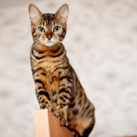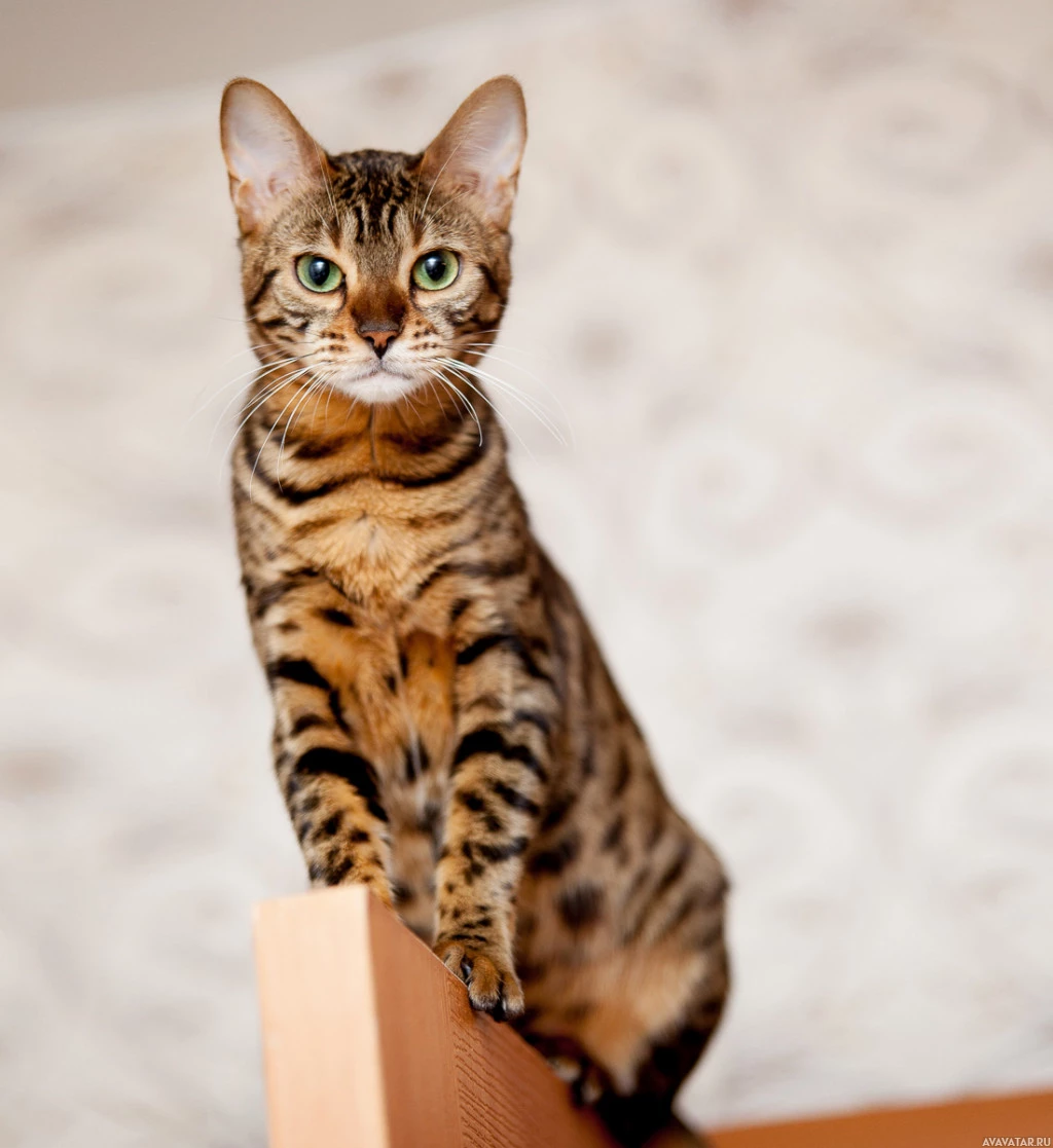 На снимке изображен бенгальский кот. Он стоит на деревянной поверхности, возможно, предмете мебели или задней части стула, с передними лапами, лежащими на краю. У кошки характерный полосатый мех и сфокусированное выражение, что характерно для этой породы.