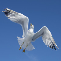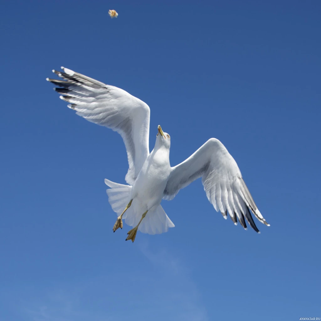 На снимке изображена чайка в полете. Птица захвачена с полностью расправленными крыльями, выставляя свои белые перья против ясного голубого неба. По-видимому, он быстро движется, возможно, в сторону пищи, как предполагает наличие под ним куска рыбы или другого продукта питания.