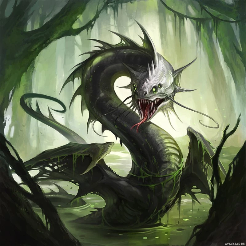 sharp teeth and eyes with glowing pupils. The dragon has scales that appear to be greenish in color, and its skin seems to have some kind of slime or moss growing on it, which suggests it might be from a swamp or