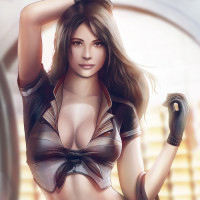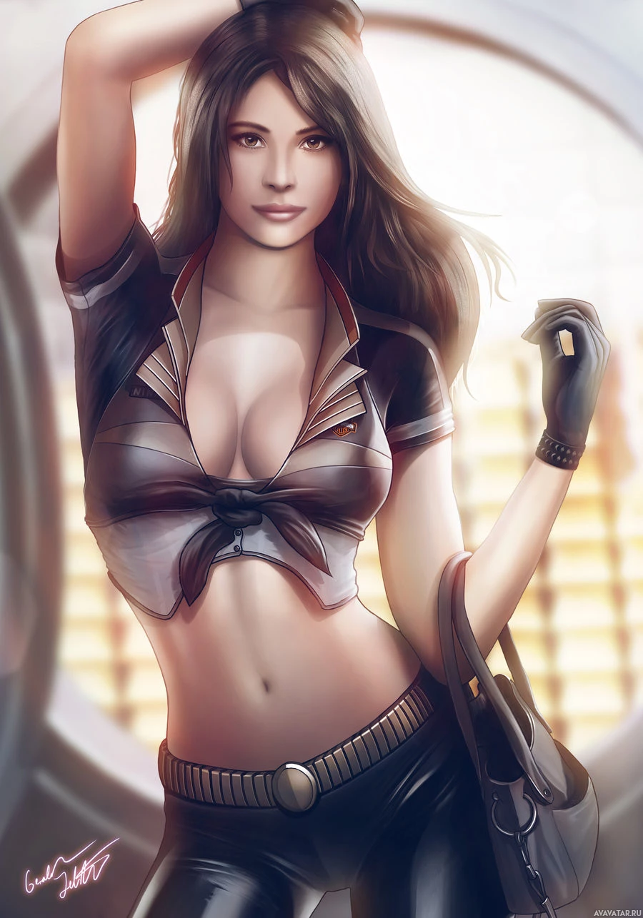 wavy hair and is striking a pose with her hand on her hip, giving an impression of confidence or readiness for action. The background suggests a setting related to aviation or adventure, possibly indicating she is part of a story where such roles are common, like comic books or