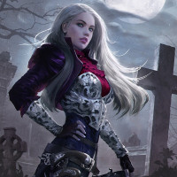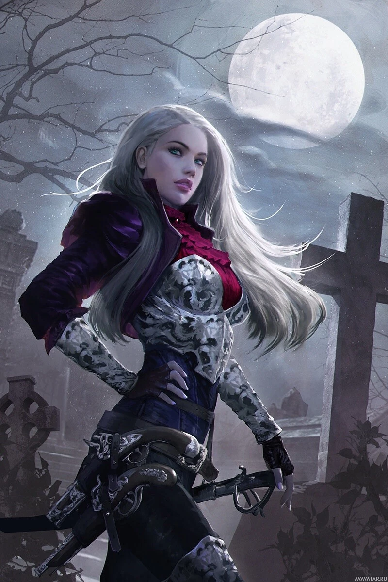 a female character with blonde hair, standing on what appears to be a graveyard or a place of ancient ruins during night. She is wearing