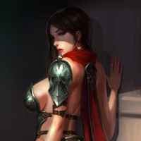 a female warrior or adventurer. She is wearing armor with metal details, suggesting she might be from a fantasy or
