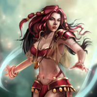 red hair and is wearing a costume that includes armor, a cape, and jewelry. In her left hand, she holds a staff with a light emanating from the top. Her right hand is raised as if casting a spell or performing some