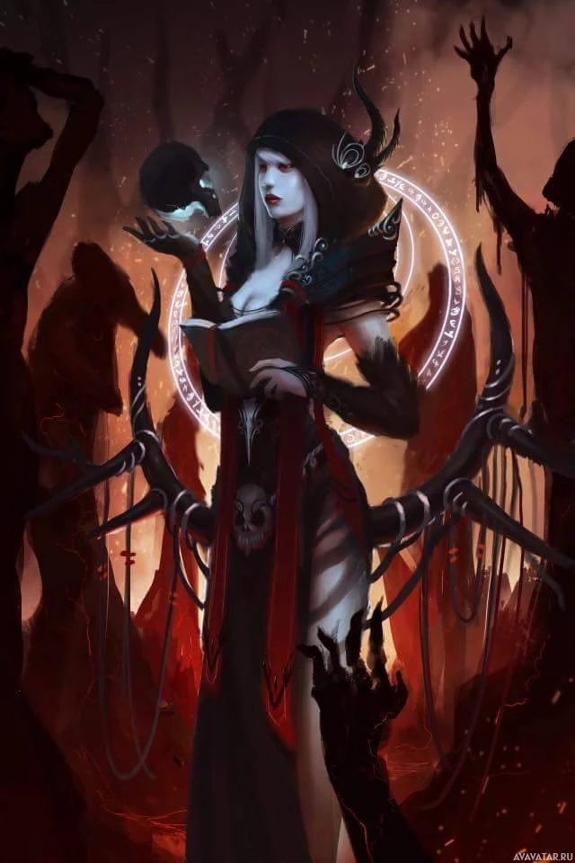 dark clothing, with elements that suggest a supernatural or occult theme. Her right hand is holding what seems to be a skull, which is often symbolic of death or the afterlife in such contexts. The background portrays