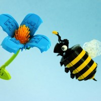 The image features two Lego figures: a bee and a flower. The bee is positioned as if it's flying towards the yellow flower with an orange center, which has green stem and leaves. Both figures are placed against a blue background that gives the impression of a clear sky.