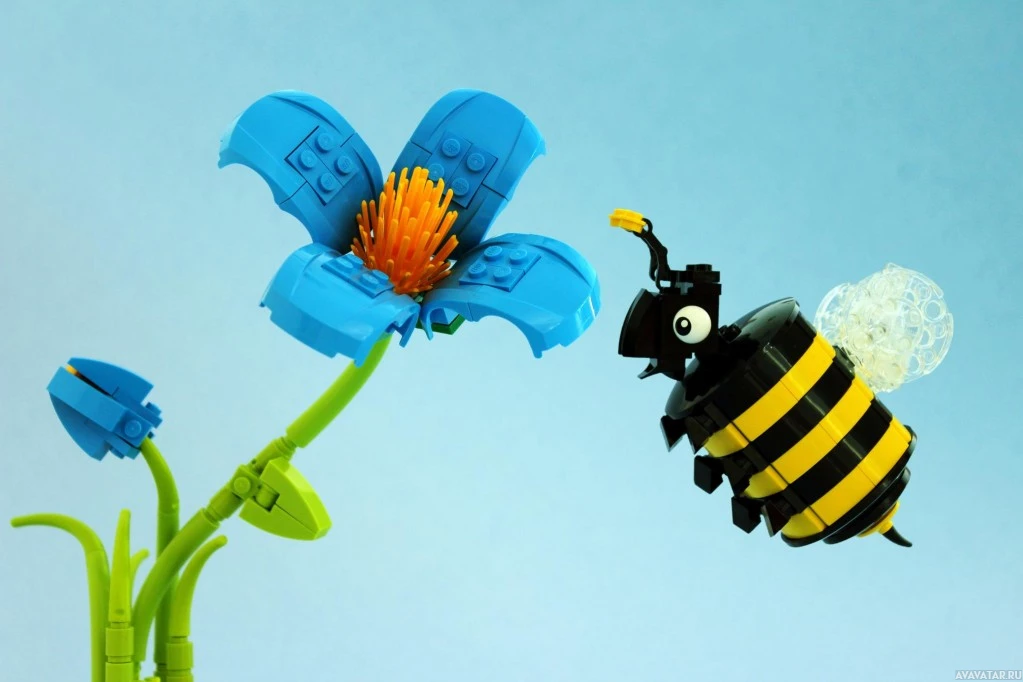 На картинке изображены две фигуры Lego: пчела и цветок. Пчела расположена так, как будто она летит к желтому цветку с оранжевым центром, который имеет зеленый стебель и листья. Обе фигуры расположены на синем фоне, что создает впечатление ясного неба.