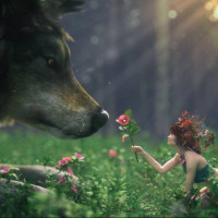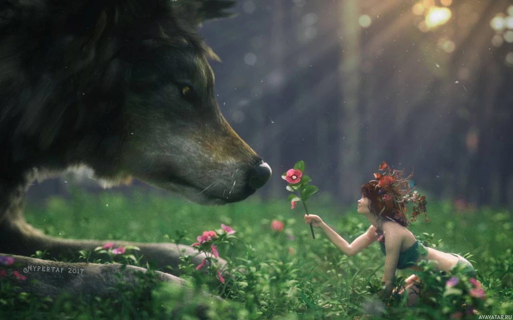 a large wolf with its head lowered towards her. The wolf's nose seems to be touching or close to the woman's shoulder, as if sniffing or greeting her. The setting looks like