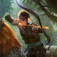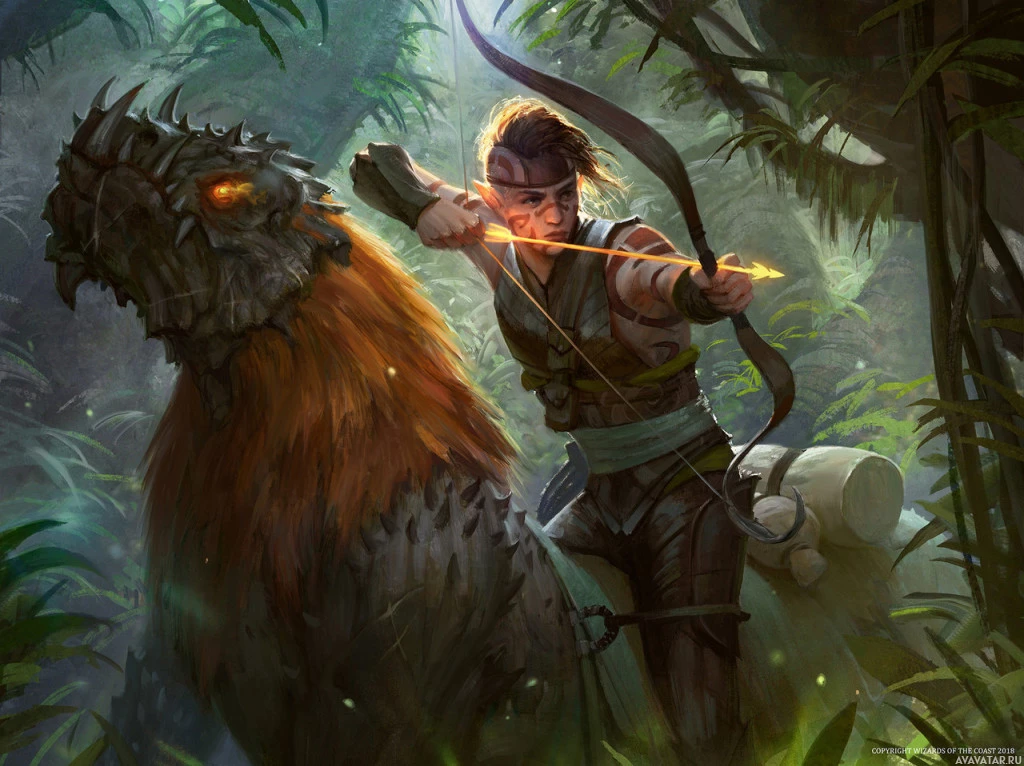 Картинка показывает фантастическую сцену с эльфом. Эльф держит лук и, кажется, нацеливает его на другое существо в лесу. Расположение кажется плотной, похожей на джунгли средой с зеленой листвой вокруг них. Стиль произведения предполагает, что это может быть видеоигра или фэнтезийная иллюстрация.