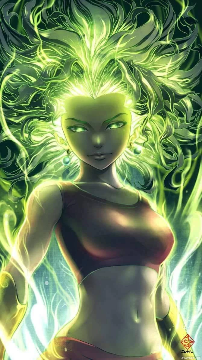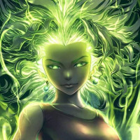 a fantasy setting and is surrounded by swirling green energy or magical particles. This character could potentially be a warrior, mage, or champion within her narrative context. The artwork has