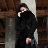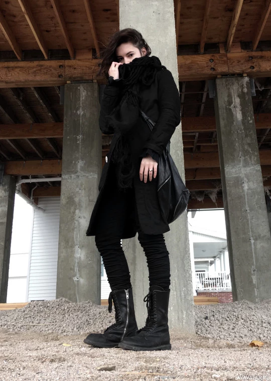 a black coat and hat, and her hands are tucked into her pockets. She has