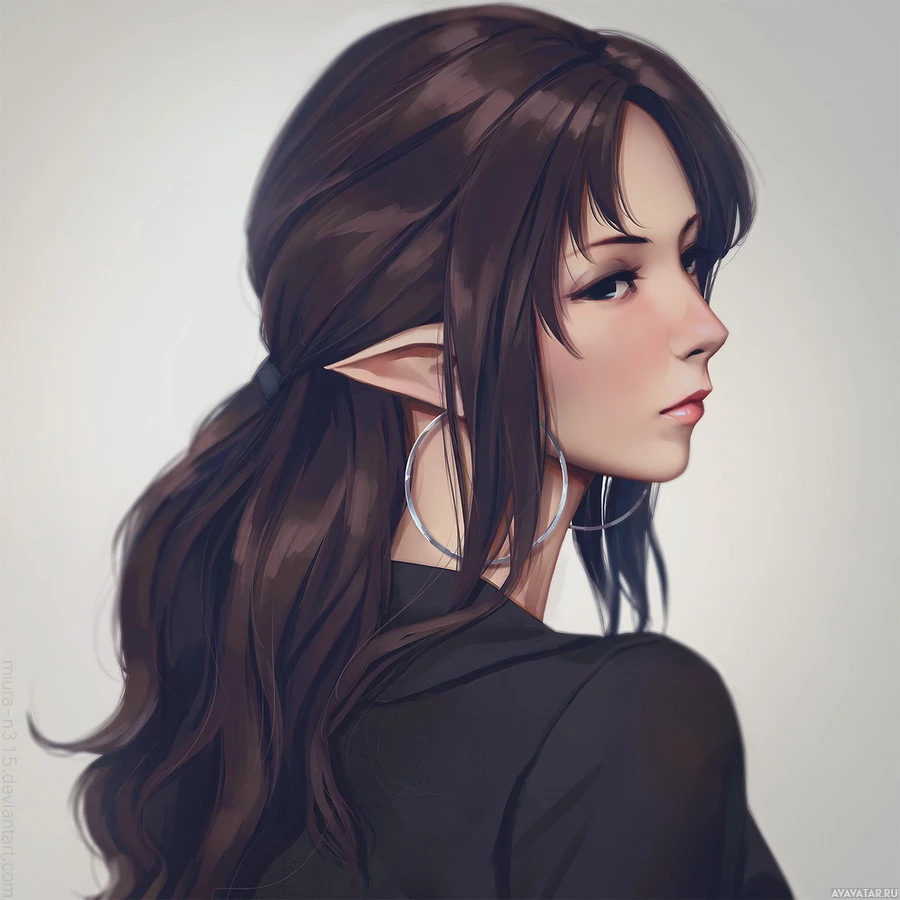 На картинке изображен иллюстрированный персонаж, который выглядит как женщина-эльф. Она изображена сзади, давая нам вид на ее спину и боковой профиль. Ее волосы стилизованы в свободные волны, и она носит серьги из серебряного обруча. Произведение демонстрирует фантастическую тему с вниманием к деталям в рендеринге черт характера.