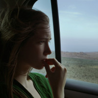 a young woman sitting inside a vehicle, looking out of the window. She appears to be in a thoughtful or contemplative mood, as she is pressing her lips together with one hand and resting her chin on her other hand. Beyond the vehicle's window, there's a clear view of