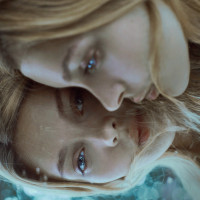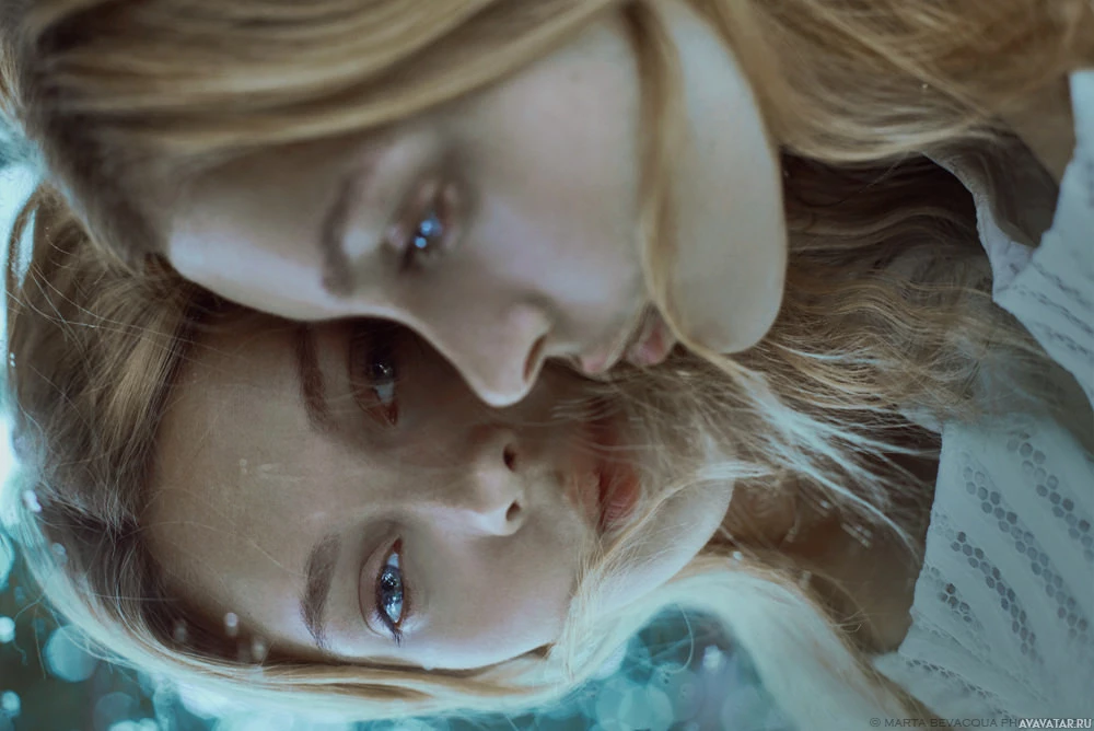 blonde hair who appears to be in front of a mirror. She is looking down at her reflection, which creates an interesting perspective. There is another person, presumably female as well, depicted in the mirror's reflection. It is not clear what relationship these two individuals have or what they are doing; however, it could be suggested that they might be engaged in a moment of intimacy or sharing