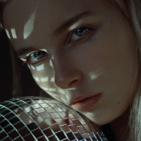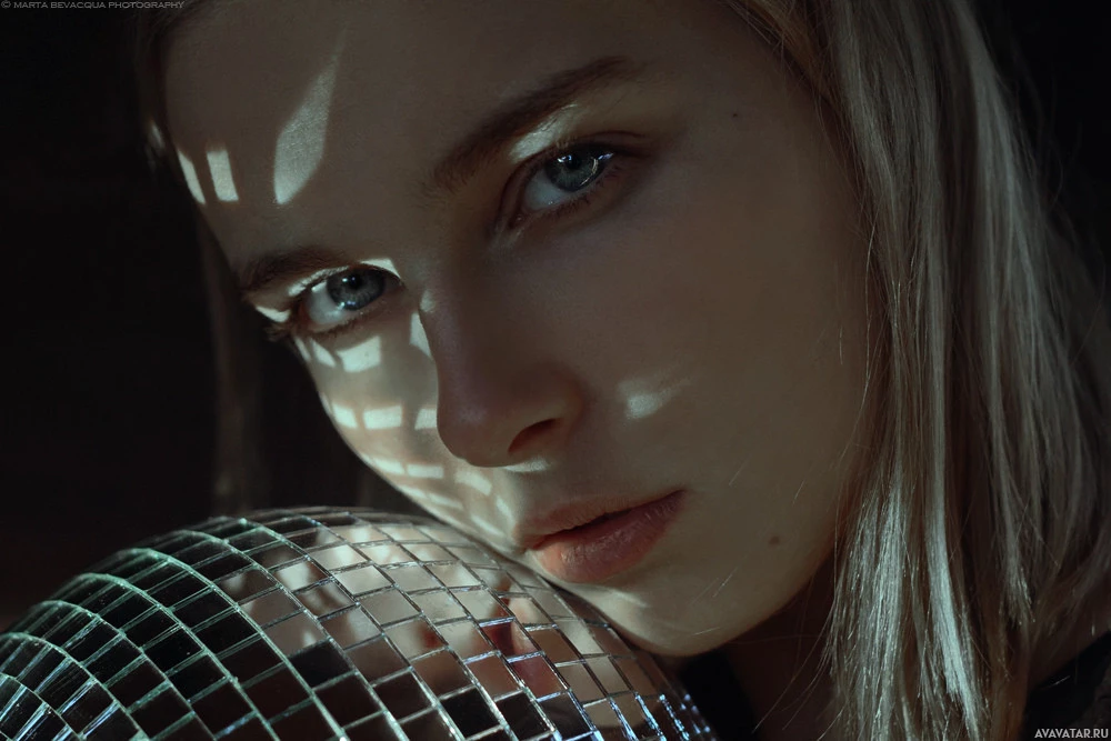 a disco ball, which suggests that the photo may have been taken in a setting with mirrors or reflective surfaces. The background is dark and indistinct, focusing attention on the woman's face and the disco ball. The overall composition gives the image an artistic quality.