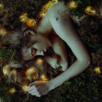 lush greenery and what appears to be small glowing objects. The individual's eyes are closed, and they seem to be in a peaceful or possibly dreaming state. The setting is natural, with a softly