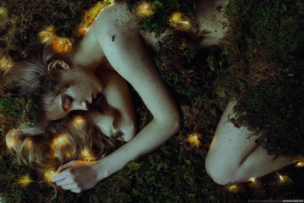 lit ambiance that gives off an ethereal and serene vibe. The person's skin tone matches the earthy tones of the environment, creating