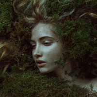 The image features a woman with her head resting on a patch of moss. Her face is partially obscured by the greenery, and she appears to be in a state of repose or possibly asleep. The surrounding environment suggests a natural setting, likely a forest or garden.