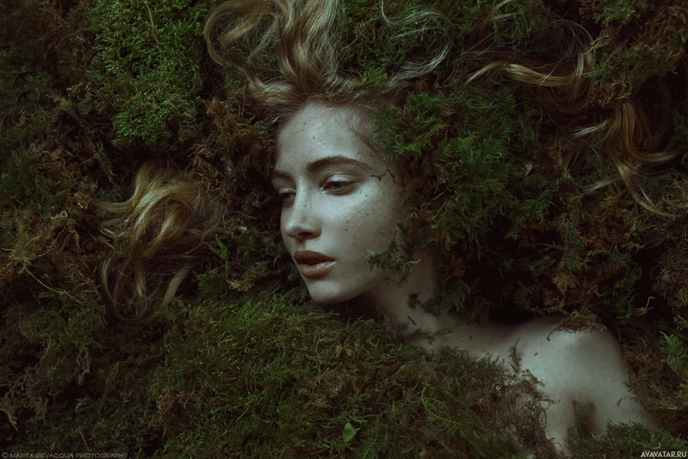 На картинке изображена женщина с головой, покоящейся на клочке мха. Ее лицо частично затенено зеленью, и она, кажется, находится в состоянии покоя или, возможно, спит. Окружающая среда предполагает естественную обстановку, вероятно, лес или сад.