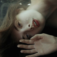 face close to the water's surface and her arms slightly outstretched as if she is swimming or floating. Her hair is visible above the water, and her eyes are closed. The background is relatively nondescript, emphasizing her as the central figure in the image.