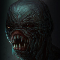 The image shows a creature that appears to be a monster or a mutated human. It has an exaggerated, grotesque appearance with large eyes and