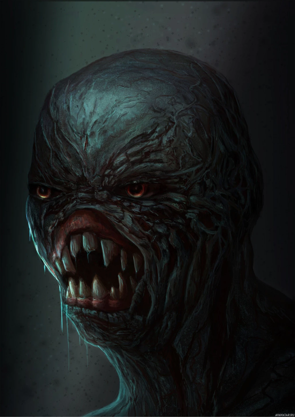 an open mouth revealing sharp teeth. The creature is depicted in what looks like a dimly