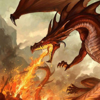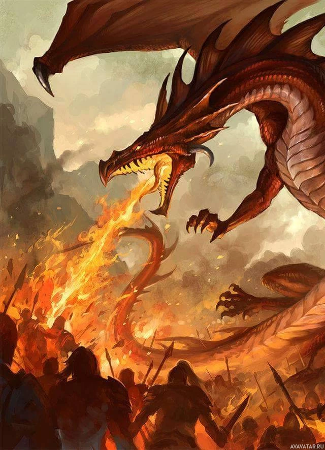 a fierce pose, with its wings spread wide and its mouth open as if roaring or breathing out fire. Flames can be seen around it, suggesting that it might be involved in combat. Below the dragon, there are
