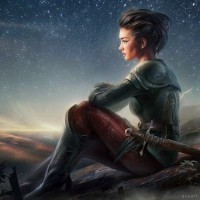 a female character sitting on what appears to be a rocky outcrop with a view of a star-filled sky in the background. She has